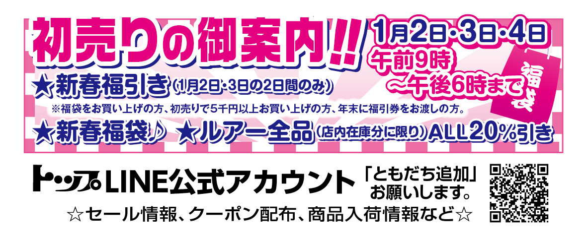 お正月のみの限定特価品や、店内ルアー(500円以上のモノ)全品20%引きも行いますので、